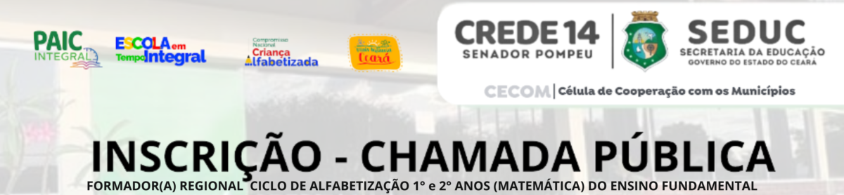 Estão abertas as inscrições para composição de banco de formadores regionais do Eixo dos Anos Iniciais (Ciclo de Alfabetização e 1º e 2º anos – Matemática) Ensino Fundamental, no âmbito do Programa Aprendizagem na Idade Certa – PAIC Integral, por meio da chamada pública 001/2026, para atuarem na Coordenadoria Regional de Desenvolvimento da Educação – CREDE 14.